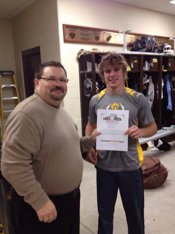Dave Mitchell of ultimatesportstalk.com presents the Lem’s Pizza Star of the Game award to Reid Stanley. Stanley carried the ball 30 times for 218 yards and 4 touchdowns in the Waynedale Golden Bears 48-7 win over Northwestern Friday night, heard here. For his performance, Stanley receives a free large two item pizza from Lem’s Pizza in Fredericksburg, OH.